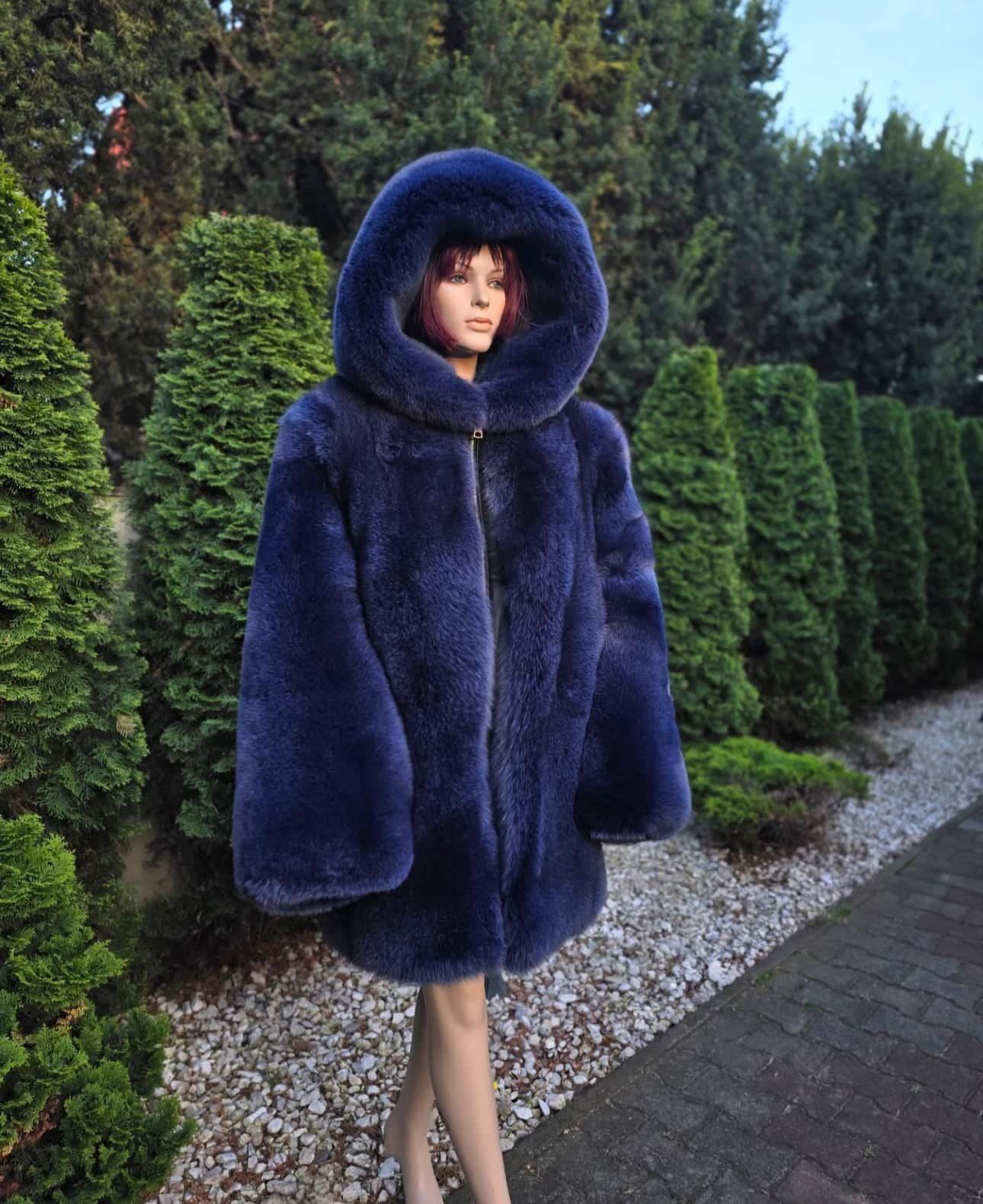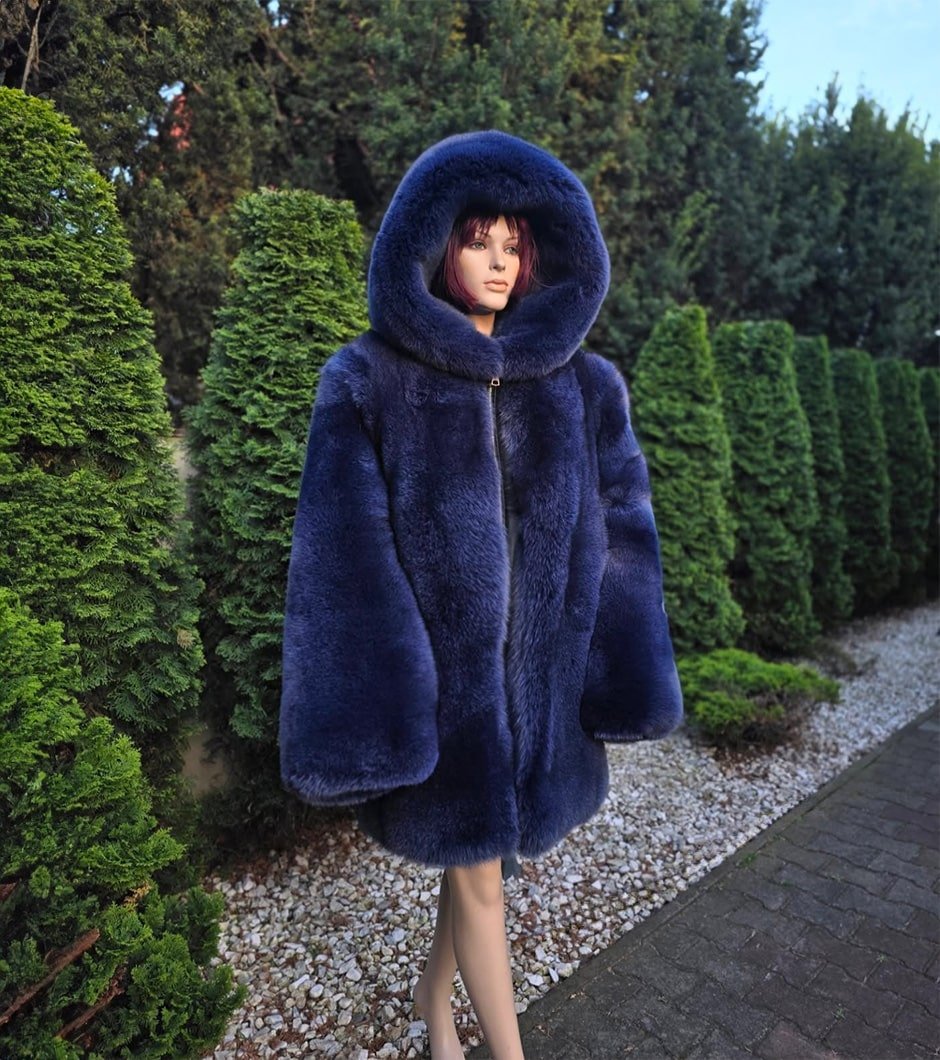 Amity | Luxury Double Sided Navy Blue Fox Fur Jacket Full Skins With Lavish Hood