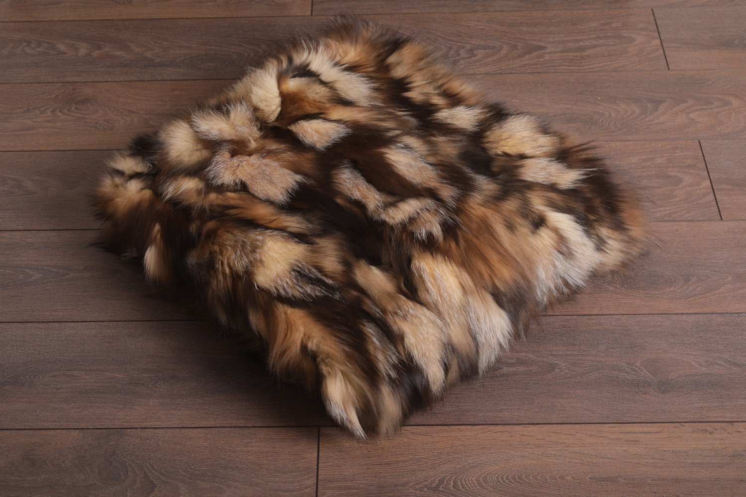 A complex color palette derived from bleaching natural silver fox fur, resulting in a harmonious blend of beiges, tans, taupes, and browns. The intricate color variations add depth and sophistication to any setting.
