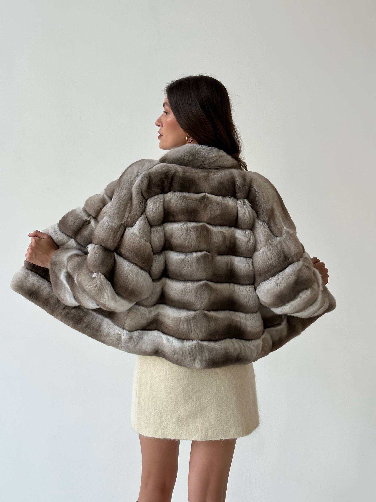 Introducing this chic short bleached to light beige chinchilla jacket, a perfect blend of modern elegance and timeless luxury. Its A-line shape offers a flattering fit, allowing for comfortable movement while maintaining a sophisticated silhouette. The minimalistic notch collar adds subtle detail and can be styled both down and standing up, providing versatility for any occasion. Ideal for transitional seasons, this jacket pairs beautifully with tailored trousers or a sleek dress, making it a versatile wardrobe staple
