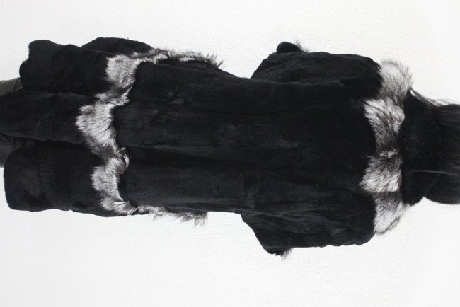 A black sheared Rex Rabbit fur stroller featuring silver fox trim . Lined with black silk inner linng & lamb’s wool support for sharp shape definition . Closes with furrier hooks & loops , plus neck luxury button . Side pockets. Wide bottom sweep and bell bottom sleeves