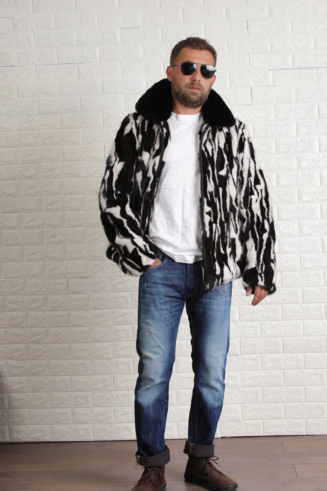 The black and white mink fur jacket is a versatile garment. Can easily be worn both with track pants, jeans or dress pants. Sectional mink stripes create an exotic look which is balanced by a standard dull skin mink collar.