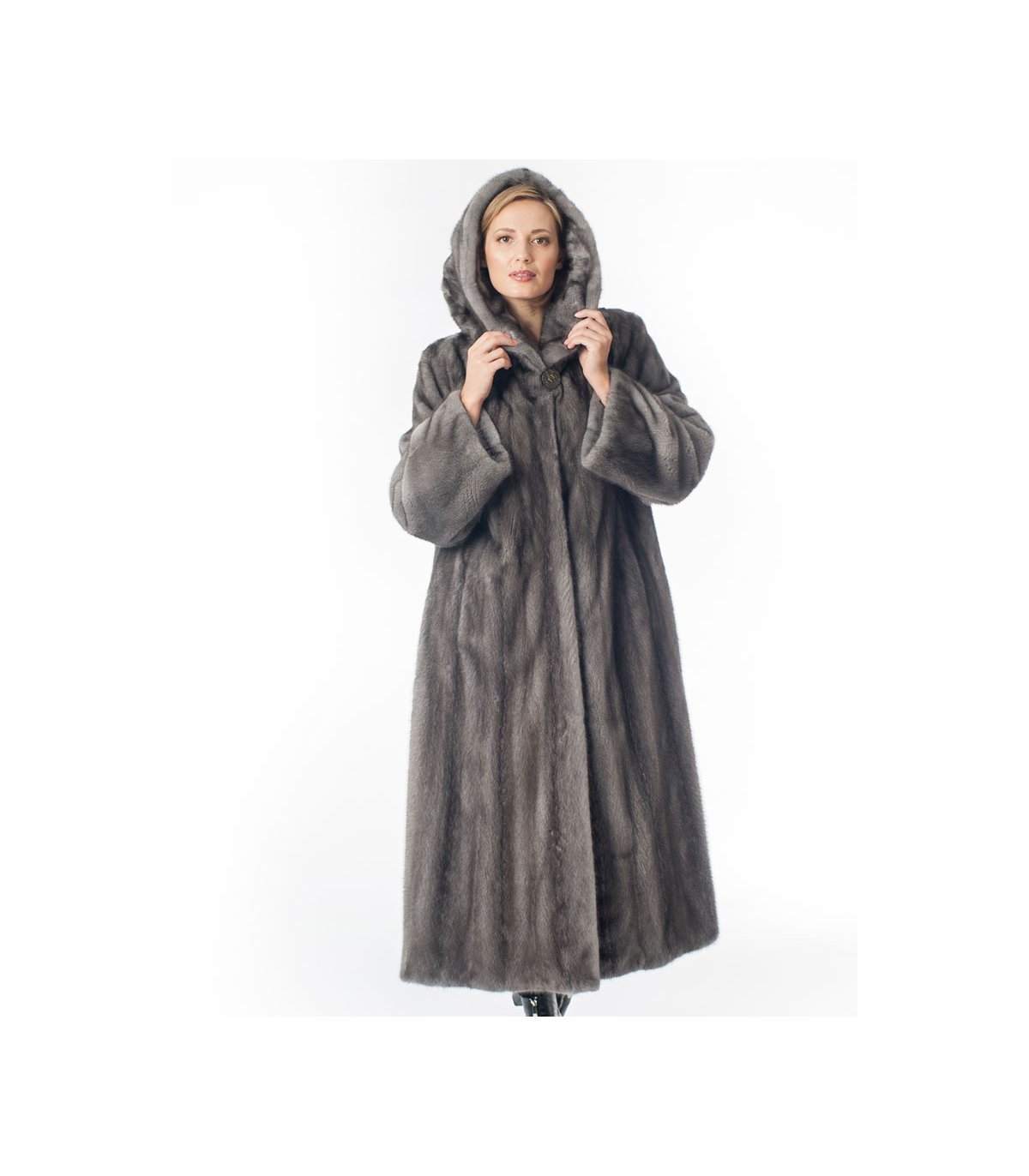 This luxurious blue-iris mink fur coat is the perfect choice for those looking for something a bit more lavish than their standard fur garment. The blue-iris mink is a beautiful choice, with its gorgeous natural tones of smoky grey. The full-length coat has a timeless silhouette, two side-entry pockets are fully lined, and a stunning matching hood with a decorative button closure at the neck. You will stand out in glorious luxury every time you wear it!
