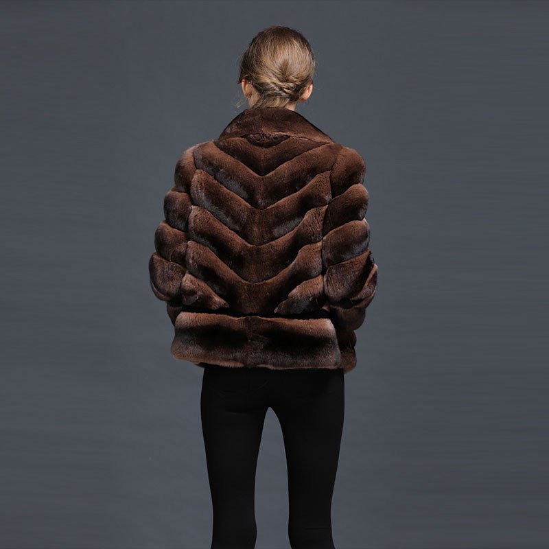 The Gabrielle chinchilla fur coat has a straight classic cut. The chinchilla skins are sewn obliquely while the ending lines of the main body and sleeves are finished with wide horizontally sewn pelts. A medium sized rounded collar compliments the casual look. The rich chocolate brown color with the contrasting black stripes creates a warm combination