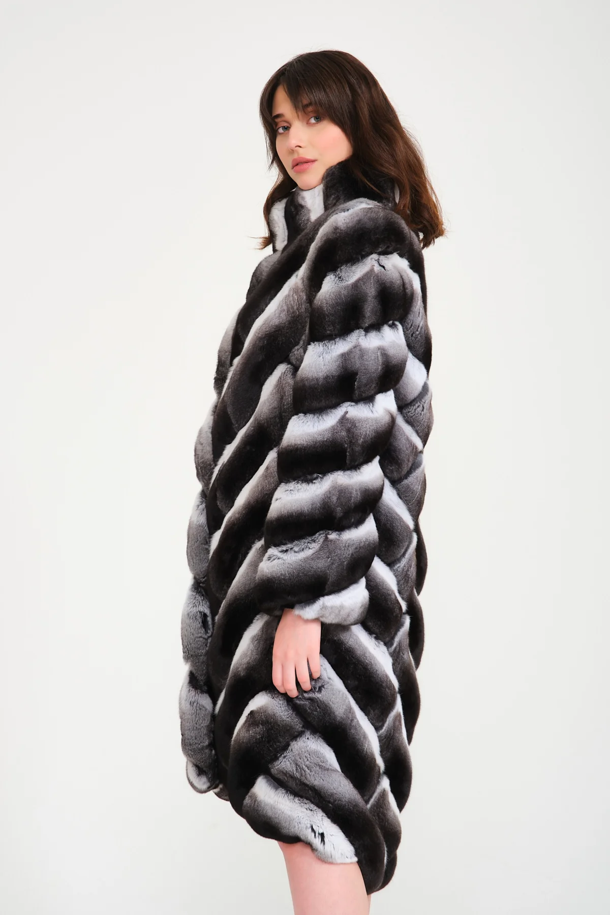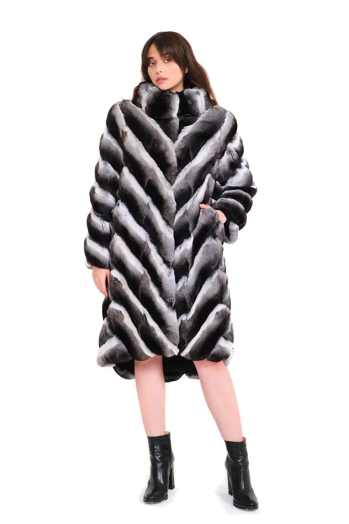 Introducing this exquisite below-knee length natural chinchilla coat, showcasing pelts artfully sewn in an elegant V pattern for a sophisticated and modern touch. The stand-up turtle neck collar enhances both warmth and style, making it a perfect choice for chilly evenings. This versatile coat can be effortlessly paired with tailored trousers and ankle boots for a chic daytime look or worn over a sleek fitted dress for an elegant evening ensemble.
