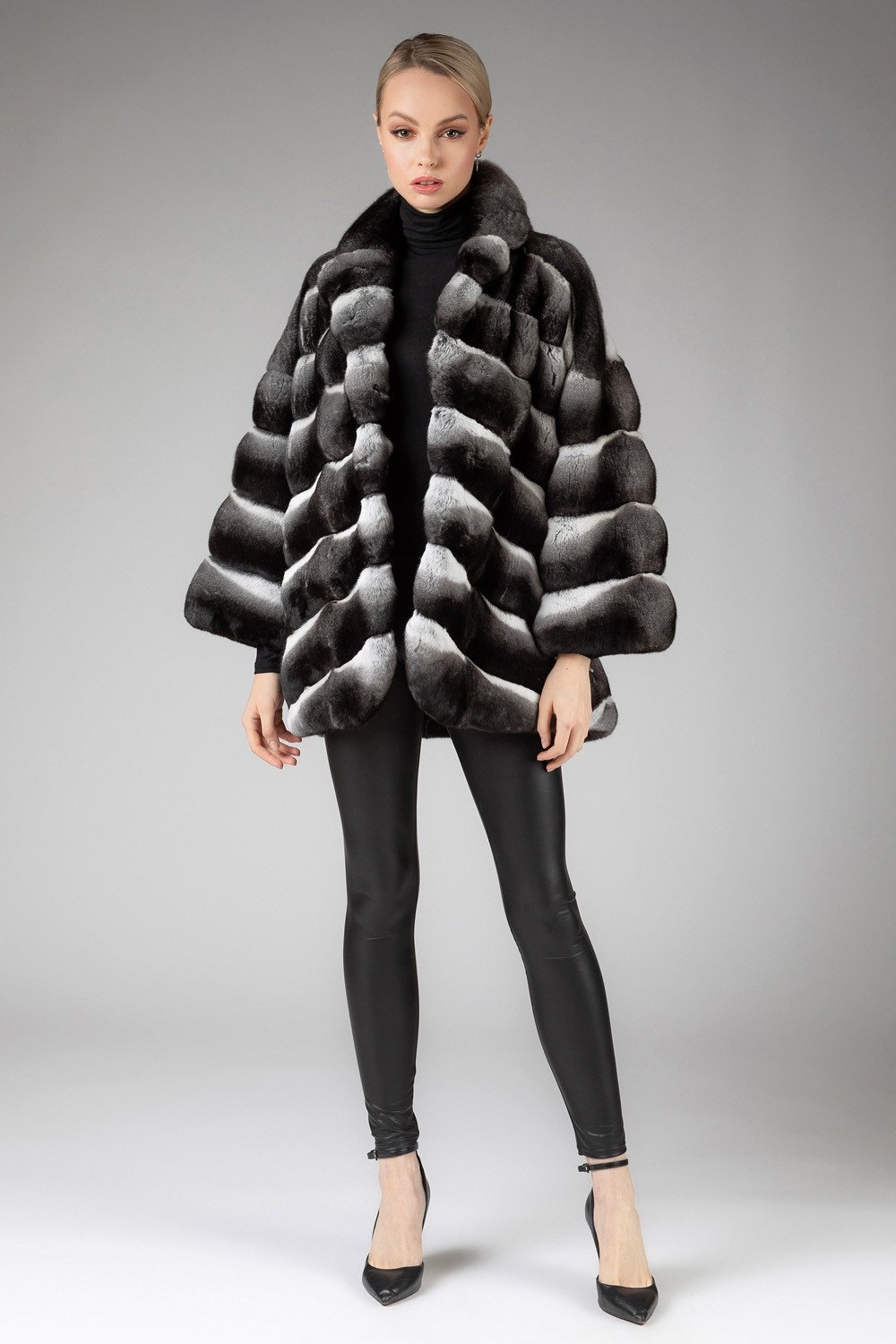 Diagonal Trapezoidal Skins: The chinchilla fur skins are cut into trapezoidal shapes and meticulously sewn diagonally across the body of the coat. This design creates a captivating and visually striking pattern that enhances the coat’s unique aesthetic. However, the shoulder area features vertical stitching for a tasteful contrast.