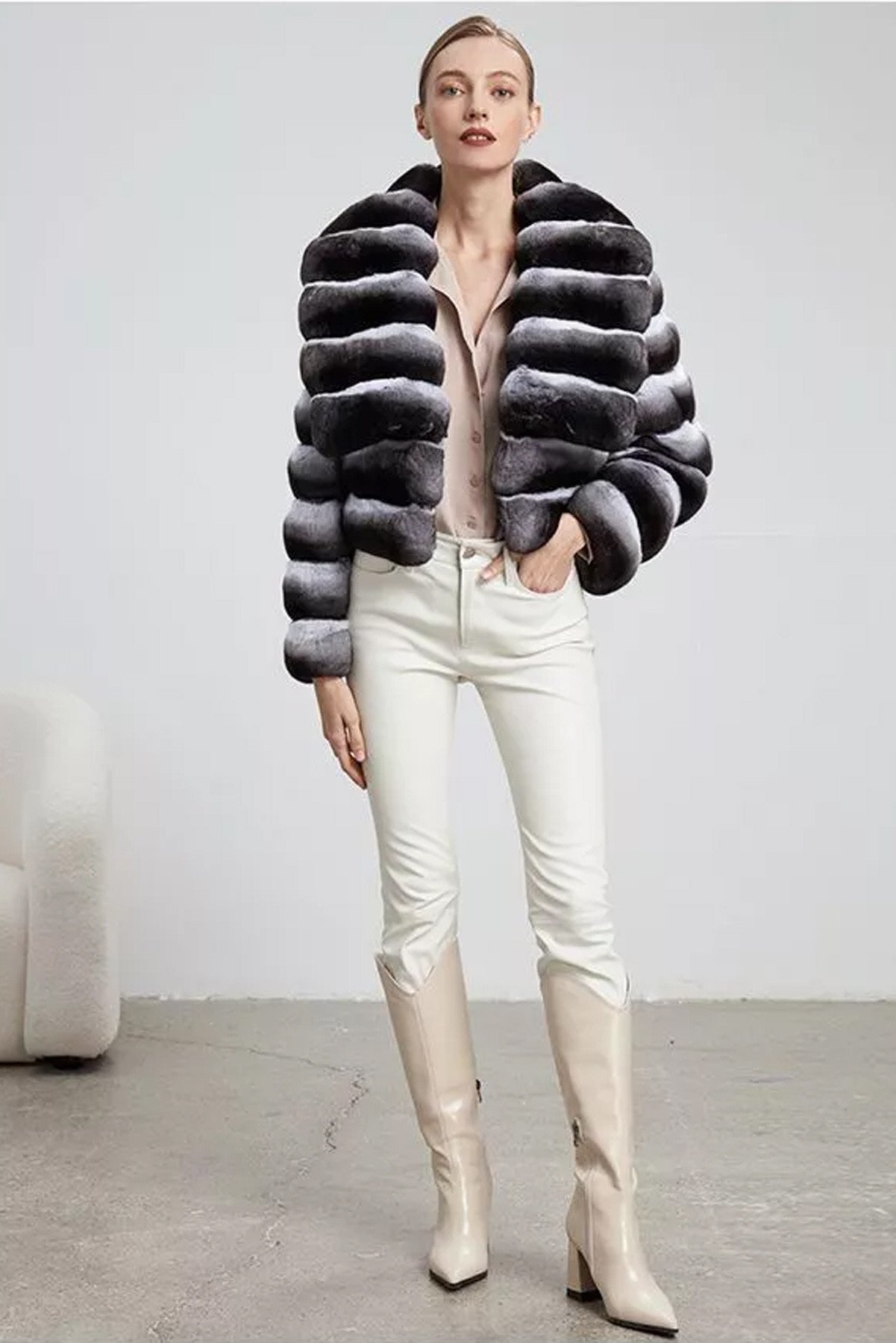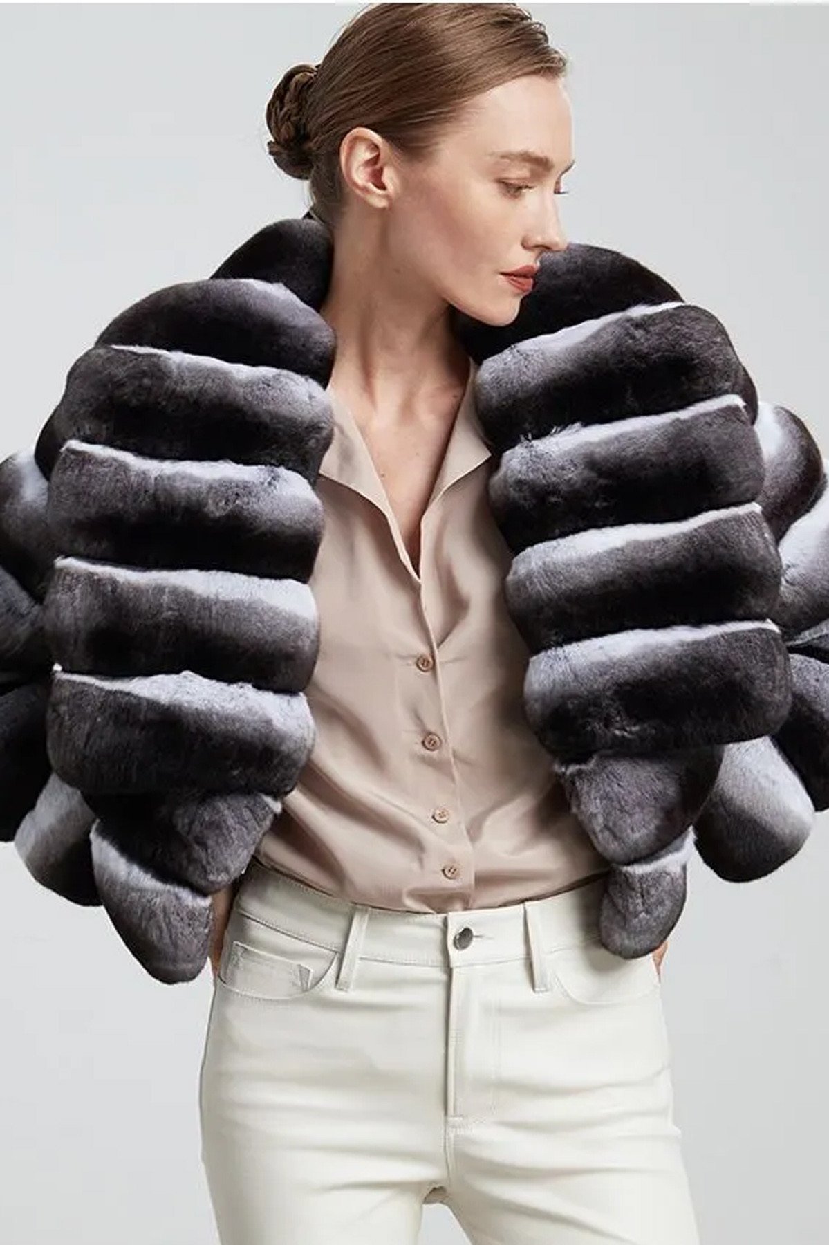 Introducing this stylish above-waist cropped chinchilla jacket, reminiscent of a chic bolero. Its unique design features widened sleeve ends that add a touch of drama and elegance, making it a standout piece for any wardrobe. The enchanting waterfall pattern collar flows gracefully, providing a soft and feminine touch. Crafted from luxurious chinchilla fur, this jacket offers exceptional warmth and comfort while maintaining a sophisticated silhouette. Perfect for layering over dresses or tailored tops, it enhances both casual and formal outfits.