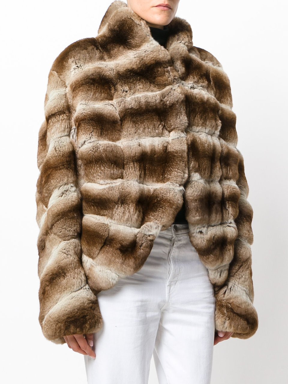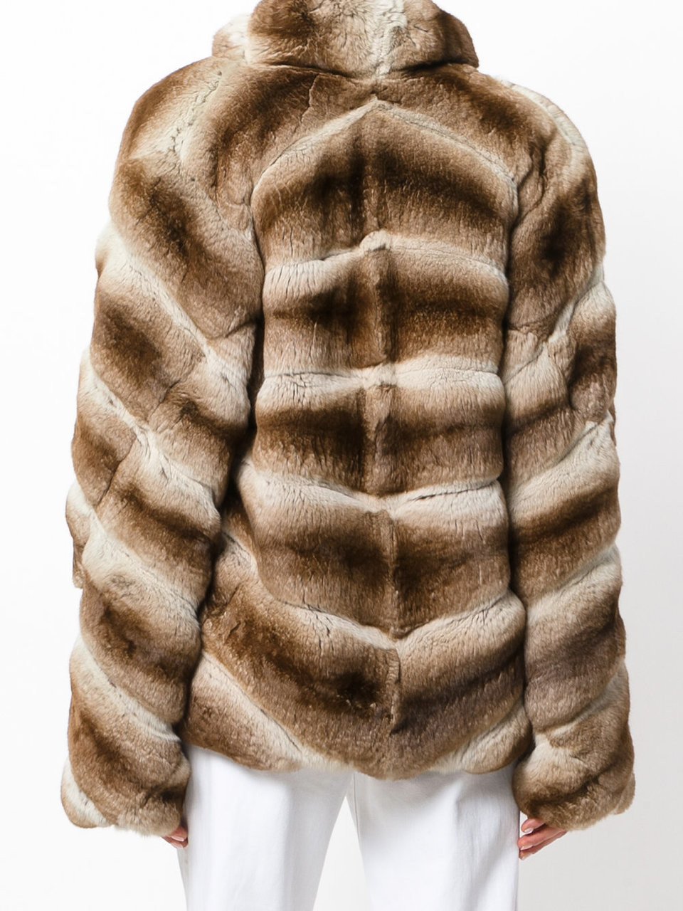 Modern design with a bohemian look and a touch of rock and roll charisma. A versatile chinchilla fur coat suitable for casual and red-carpet occasions. Featuring a stand-up collar and an obliquely cut hem. Earthly tones that will match with whites, beiges, browns, and blacks.