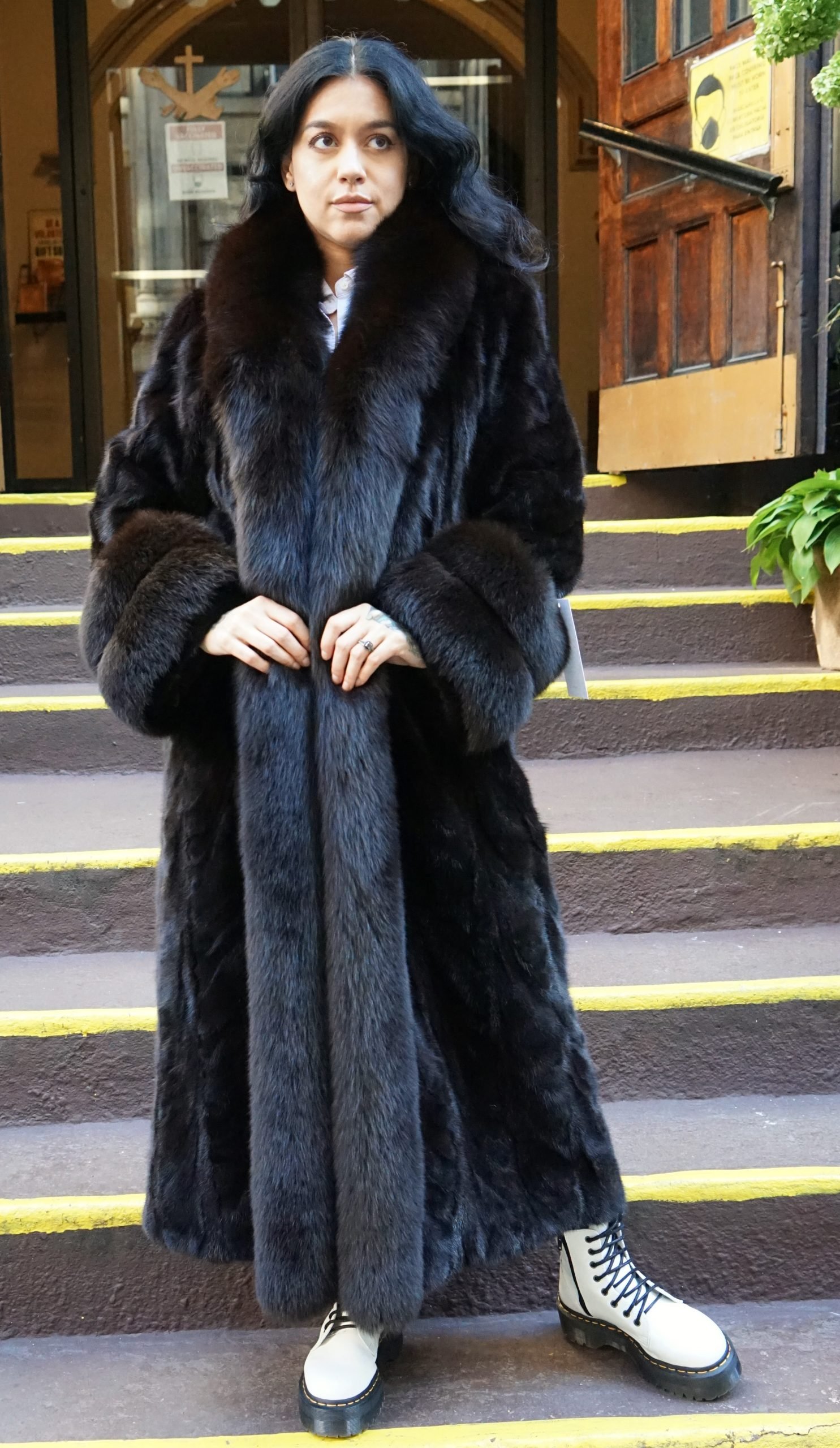 Full Length Mahogany Mink Section Coat Fox Tuxedo and Cuffs