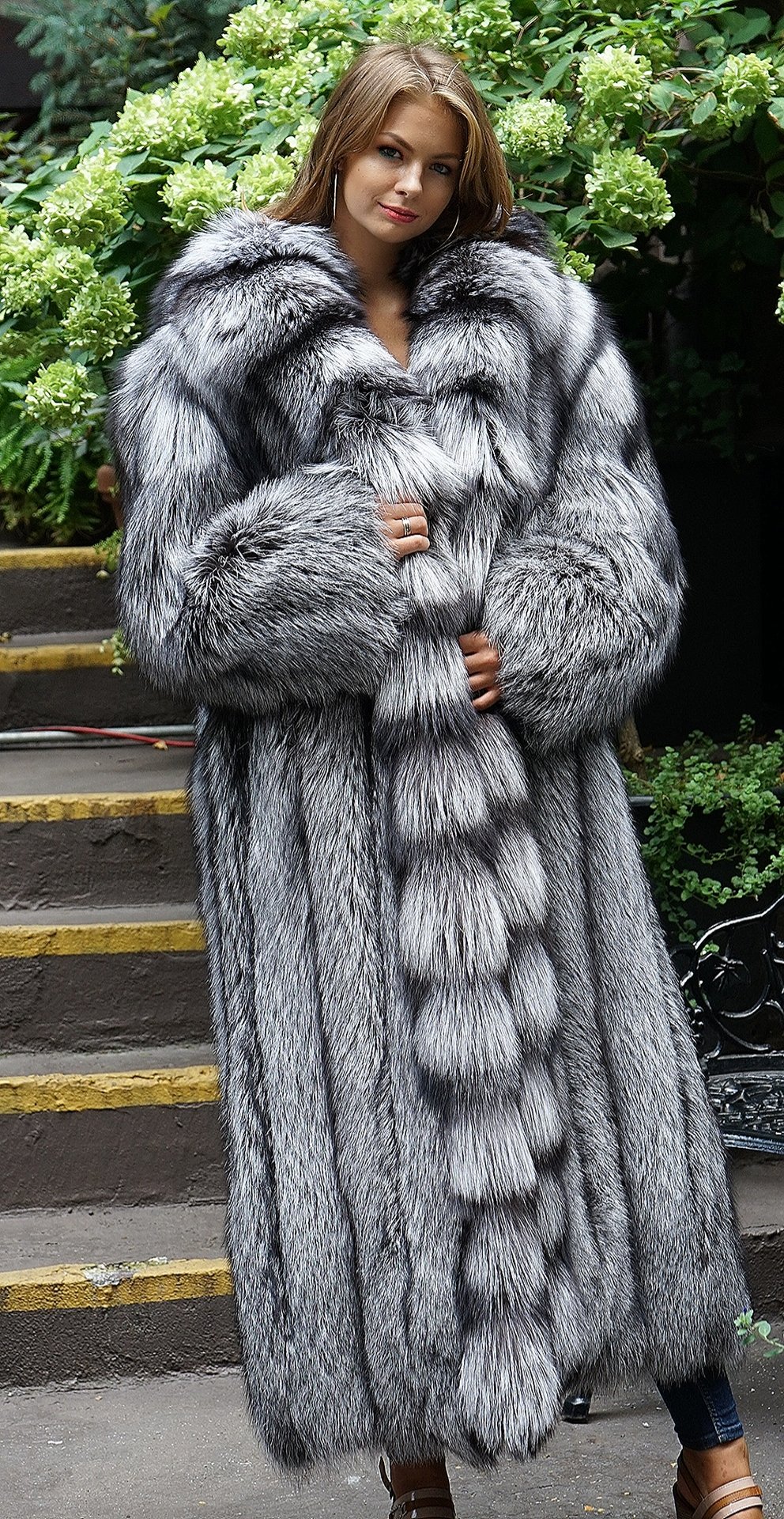 Full Length Silver Fox Coat Cross Cut Tuxedo 7634