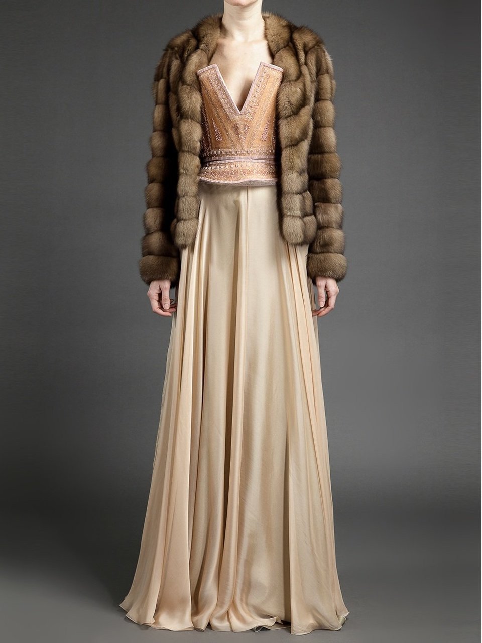 Play up your proportions! This tailored Russian golden sable fur coat defines your waist whether you wear it open or closed. The shiny, plush pelts are stitched diagonally across the body to create the subtle v-neck and pull in at your smallest point. The hips flare out to a comfortable fit with horizontal pelt arrangement and hidden pockets.