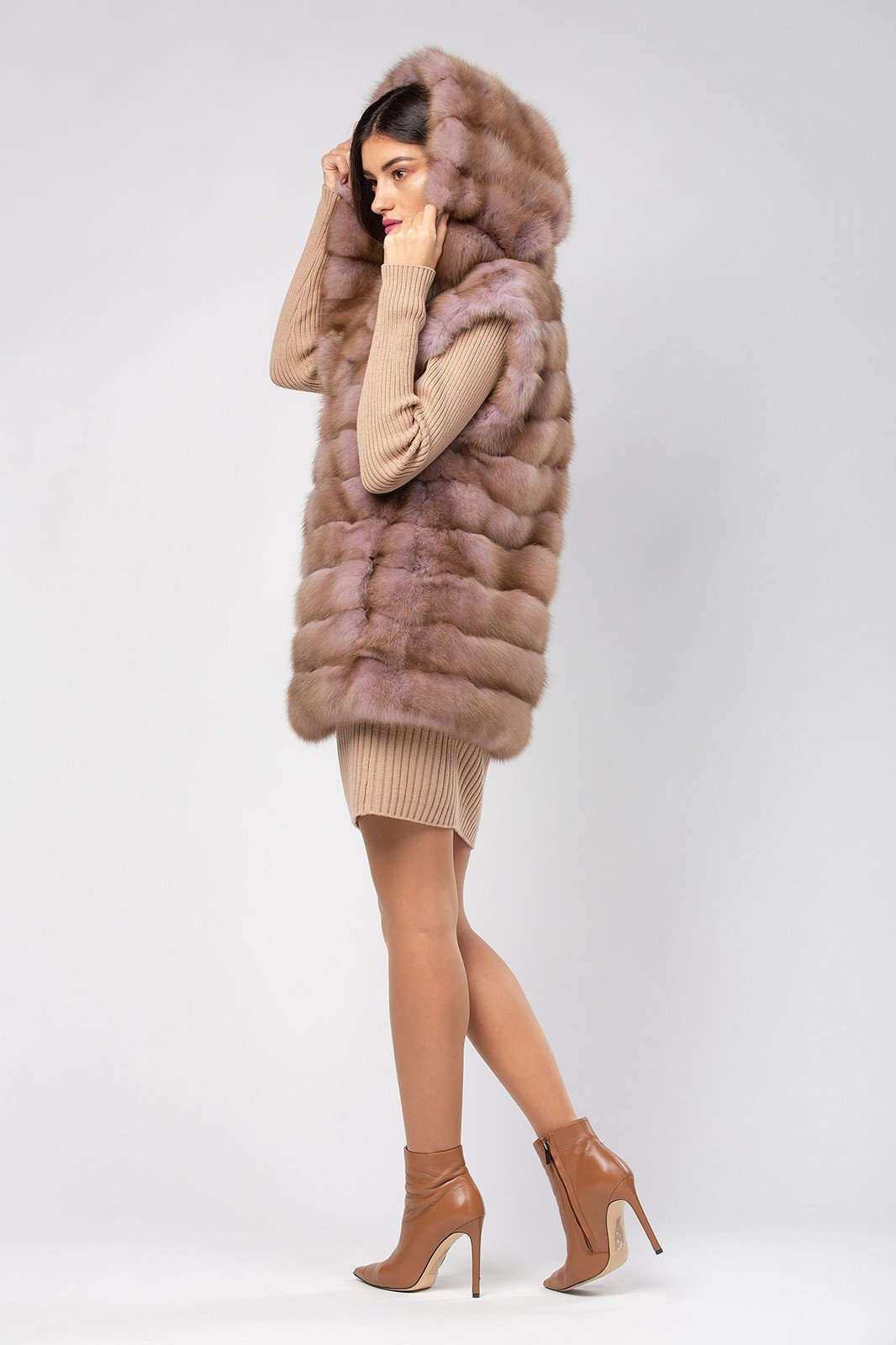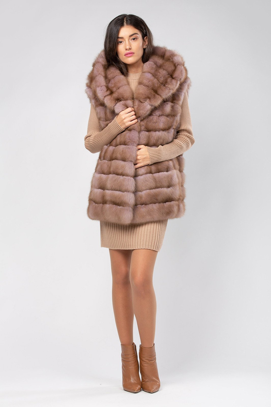 Transform your wardrobe with this stylish light brown sable fur vest, designed for both comfort and sophistication. Featuring a flattering tapered waist, this hip-length vest accentuates your silhouette while providing a cozy fit. The oversized hood adds a contemporary edge, offering stylish protection against the elements. Crafted from luxurious sable fur, this vest ensures exceptional softness and warmth, making it perfect for layering during cooler months. Versatile and chic, it can effortlessly elevate casual outfits or complement elegant ensembles.