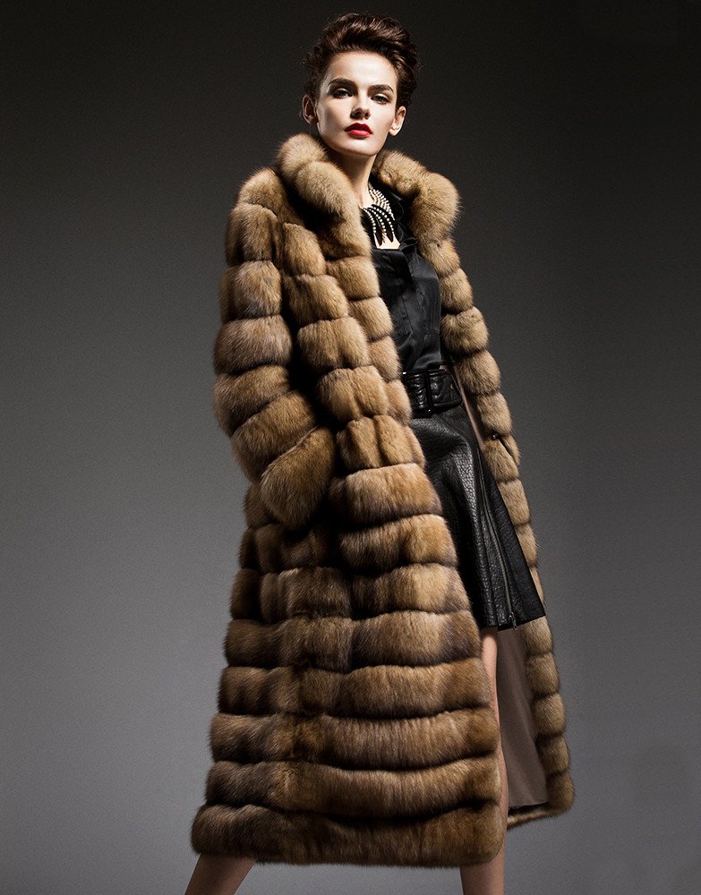 The stunning sable coat features the softest, fullest stripes of richly colored sable fur from head to toe. Rich caramel brown and flecks of gold provide exquisite, authentic color that only comes from the highest quality furs. The strips of fur are hand-sewn and lined with light brown satin for a seamless look across the front and back. A plush, tall collar covers your neck, soft fur sleeves hang all the way down to the wrists, and the coat ends at mid-calf. Whether you wear it open with hands in pockets or close the coat with hidden loop closures, this Long Golden Sable Coat pairs beautifully with a stunning pair of heels.