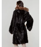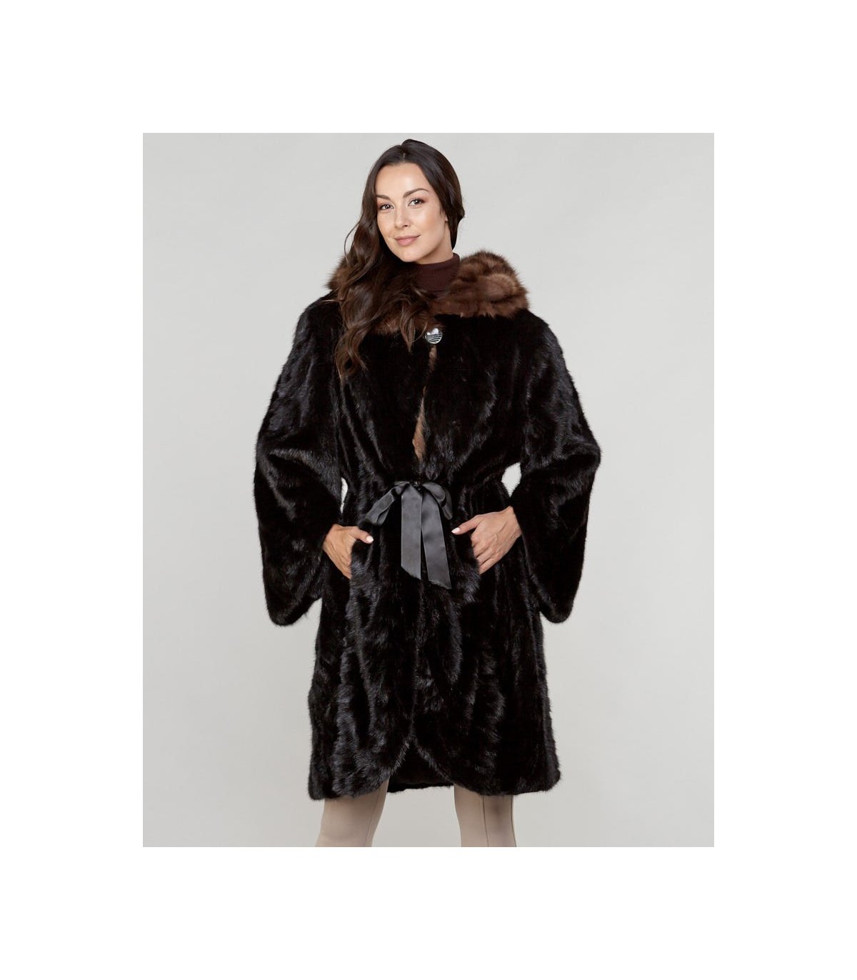 Accentuate your figure with our Long Hair Mink Fur Princess Coat with Sable Fur Trim that features a satin ribbon belt for her. Long hair mink fur is dyed black and accented with A large hood and collar make a dramatic entrance along with pagoda sleeves and hidden allover closures.