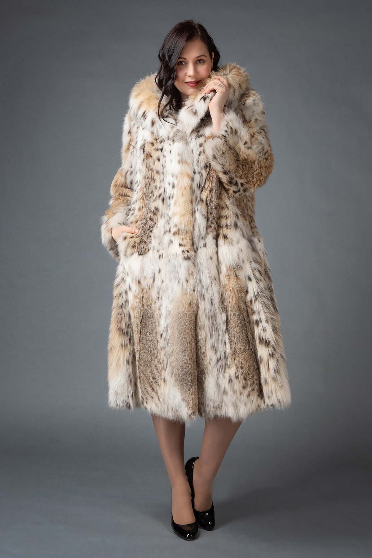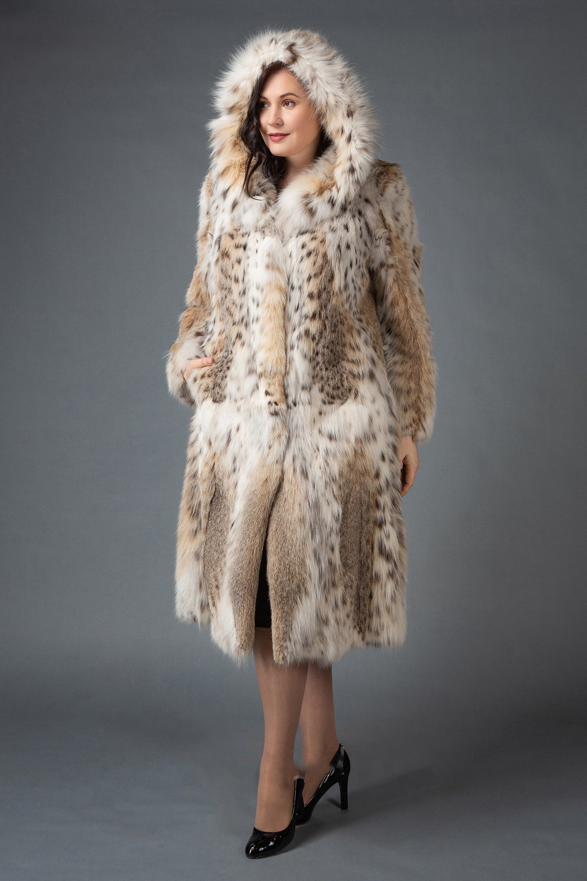 Discover the elegance of this 3/4 length lynx bobcat fur coat, a perfect blend of luxury and functionality. Designed with a stylish hood, this coat features a flattering A-line silhouette that gracefully drapes over the body, enhancing your figure with a wide bottom sweep for a dramatic flair. The accompanying belt cinches at the waist, allowing for personalization of fit and style. Crafted from premium lynx bobcat fur, this coat is not only warm but also showcases a unique texture and pattern that sets it apart.