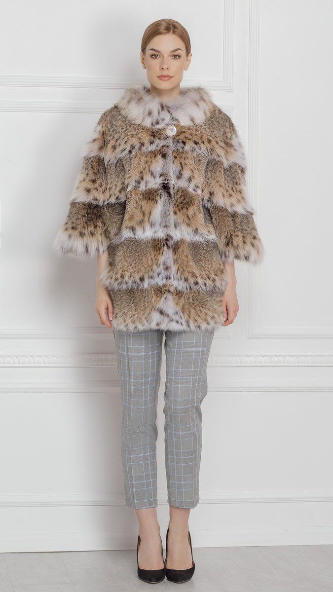 A combination of exotic look and elegant design. The Anastasia lynx coat boasts crisp lines , a modern rounded , low-cut collar and cropped , bell bottom sleeves with horizontally stitched bobcat lynx skins.