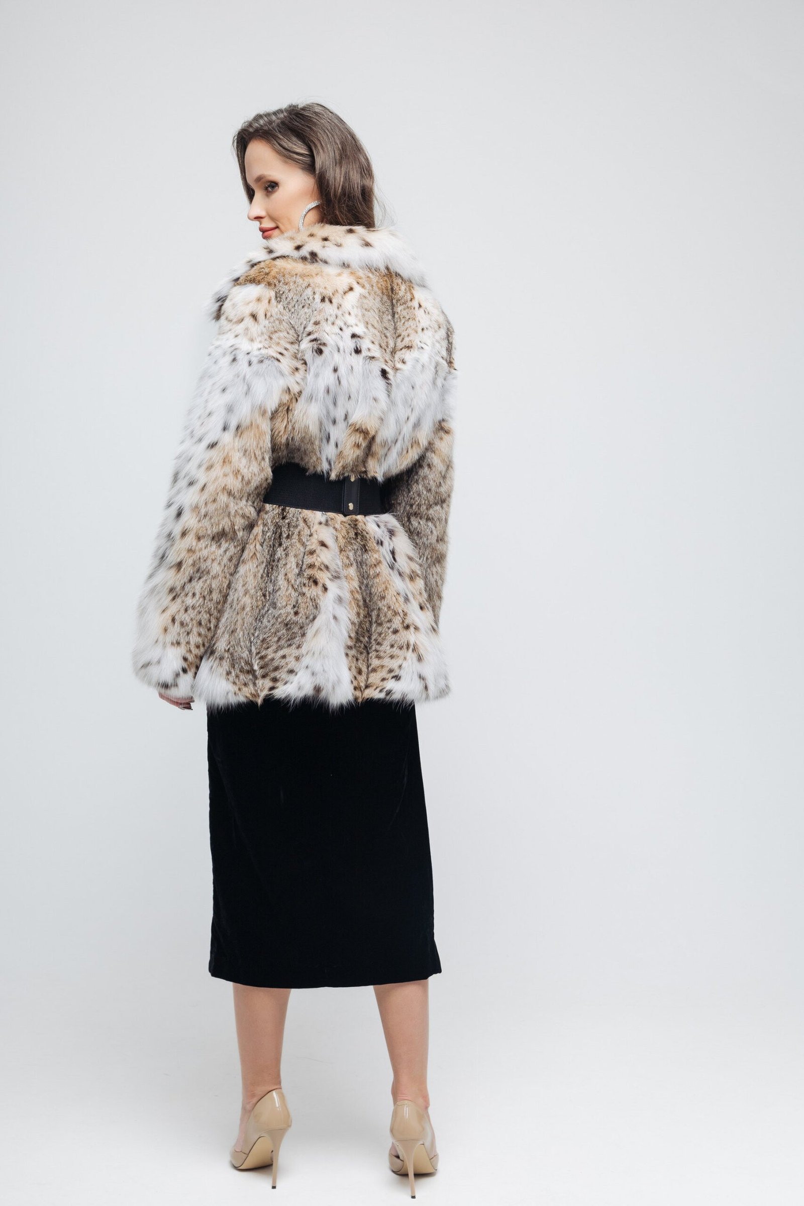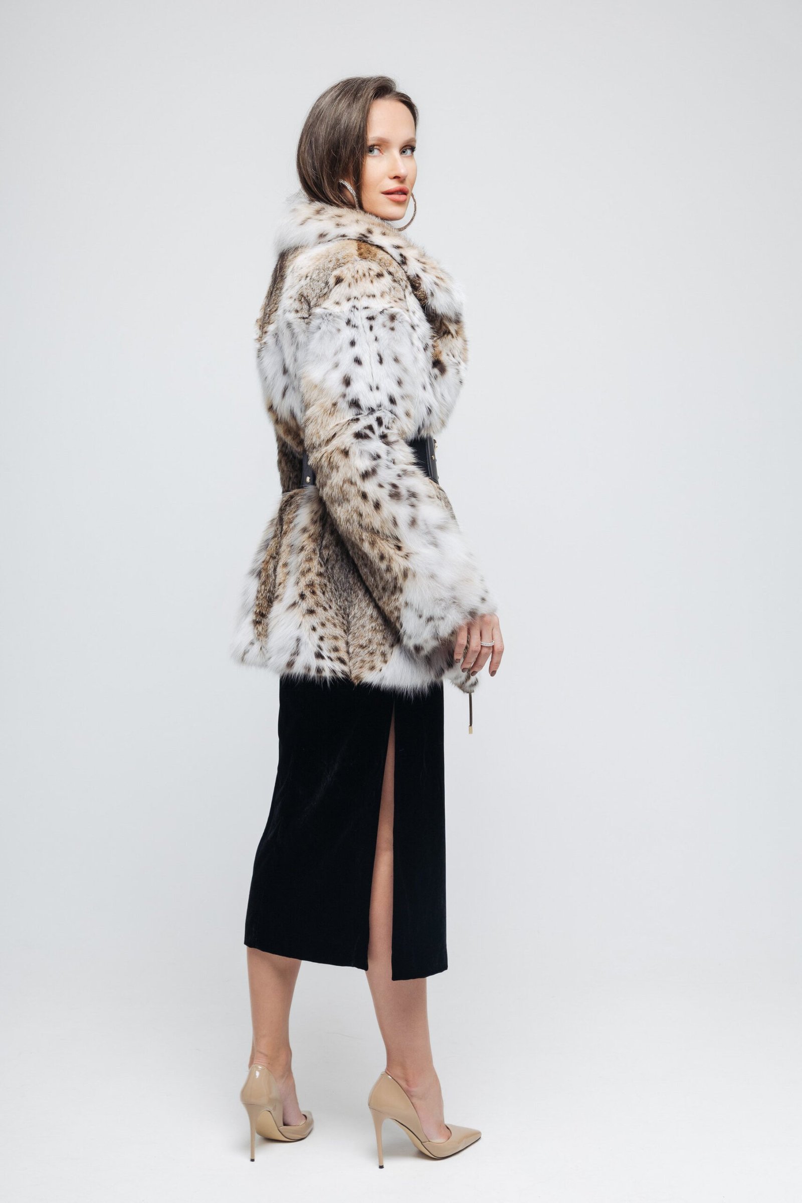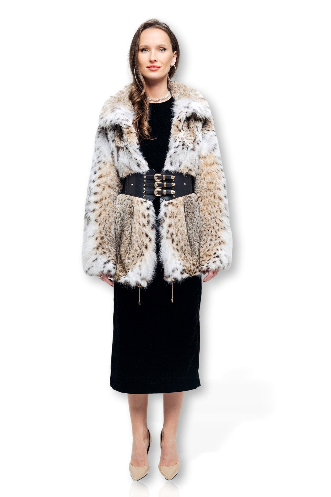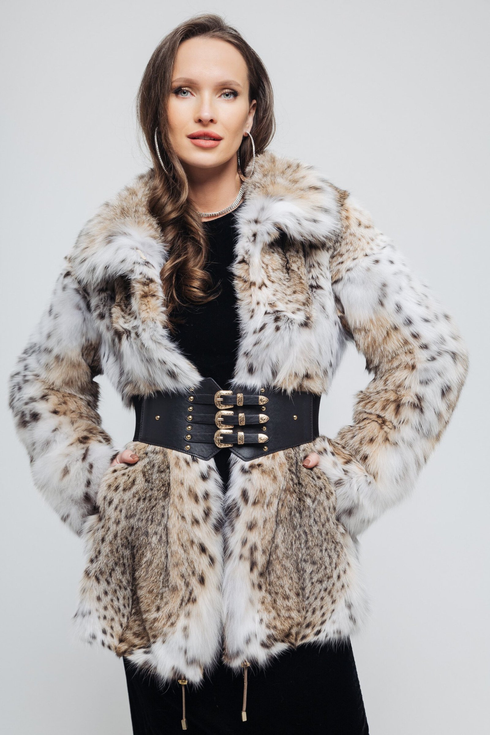 Introducing this mid-hip length lynx bobcat coat, a perfect blend of style and sophistication. Designed with an elegant A-line cut, this coat flatters a variety of body shapes while providing a comfortable fit. The flowing silhouette adds a touch of femininity, making it ideal for both casual and formal occasions. Featuring drawstrings at the bottom, you can easily adjust the fit for added style and comfort, allowing for versatility in your loo