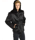 The coat is made from genuine rabbit fur and features a matching rabbit-fur hood. Both feel soft and warm to the touch, but look handsomely masculine.