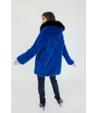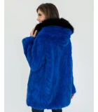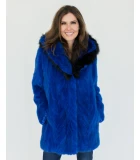 This luxurious coat is crafted from mink fur dyed a deep blue and features a large attached hood trimmed with dyed black fox fur. It offers soft satin lining, one interior pocket, two side entry pockets, a button loop closure at the neck, and concealed snap closures, blending opulence with functionality.