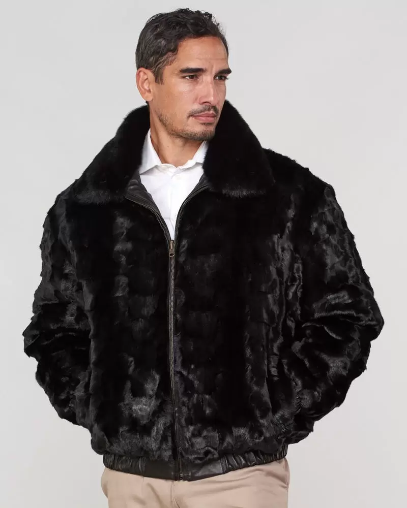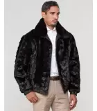 The Mink Fur Bomber Jacket Reversible to Leather in Black is an exceptional garment for men who prefer a handsome style. General pieced mink fur is adorned with a full pelt collar. The reverse is designed with genuine leather and two pockets to showcase the trendy bomber style for men.