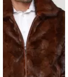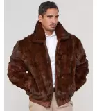 The Mink Fur Bomber Jacket Reversible to Leather is an exceptional garment for men who prefer a handsome style. General pieced mink fur is adorned with a full pelt collar. The reverse is designed with genuine leather and two pockets to showcase the trendy bomber style for men.