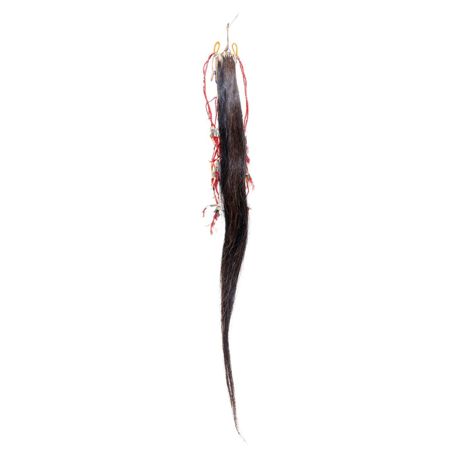 Northern Plains hair drop with red beading with accents on hide, long quilled drops ending in tin cones with red feather fluffs, long black horse hair drop now doubled up on beading.