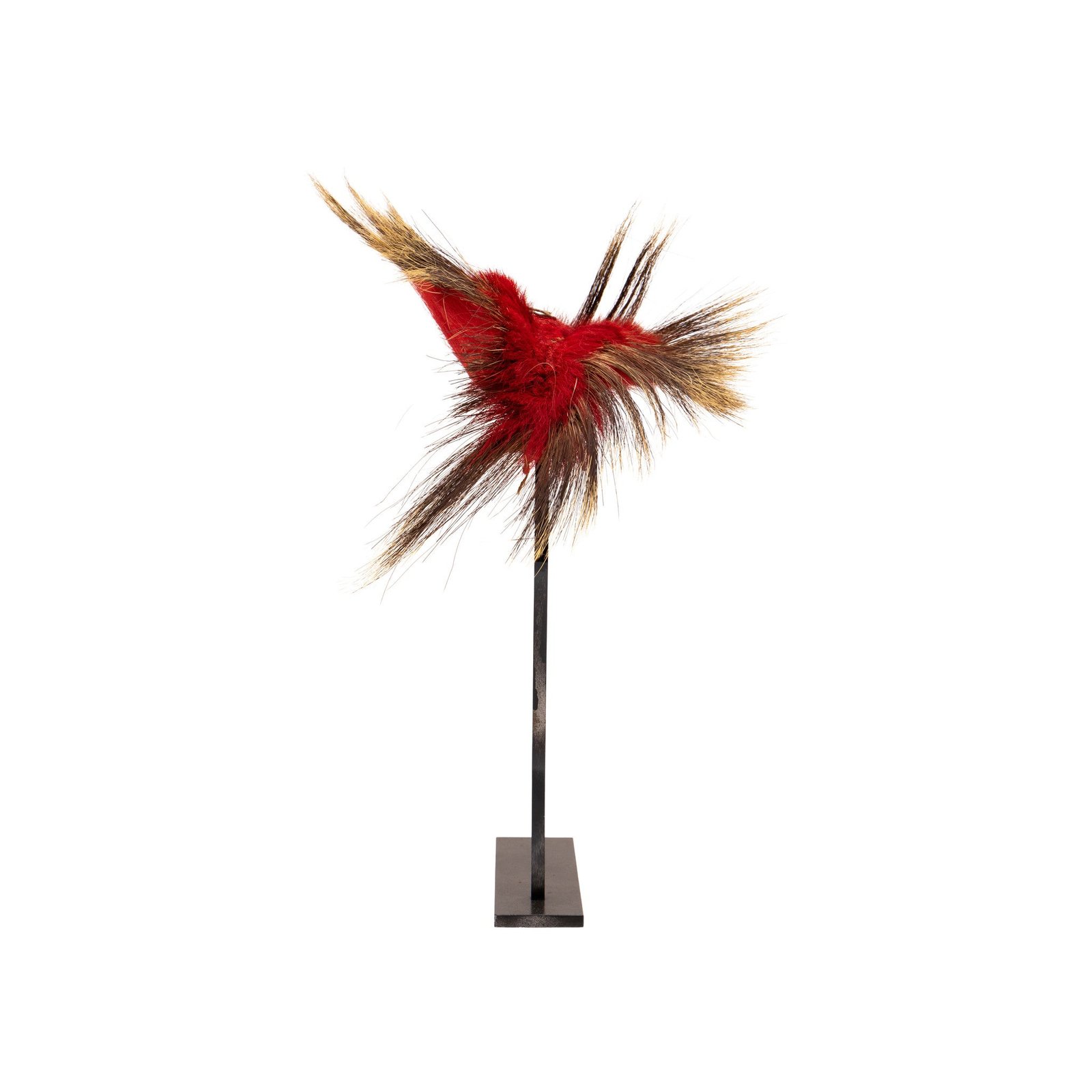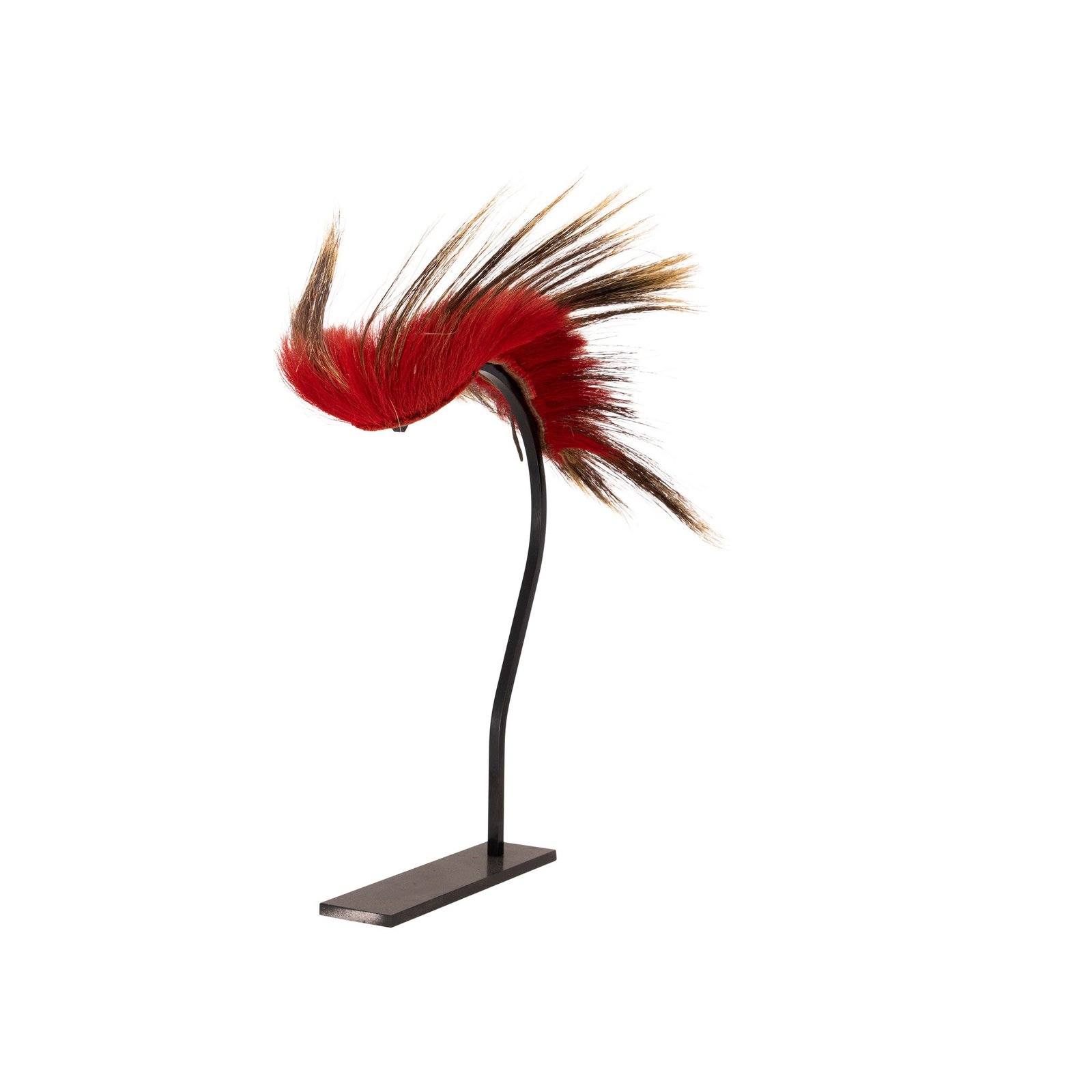 Vintage Plains Hair Roach. Great Plains-Northern Plains Hair Roach (headdress). Red & Yellow dyed deer tail with porcupine quill accents, center finely woven and clipped deer tail. Traditional male headdress of a number of Native American tribes in what is now New England, the Great Lakes and Missouri River regions, including the Potawatomi who lived where Chicago now stands. The porcupine hair roach is often made of guard hair of the porcupine, the tail hair of the white-tail deer, moose hair, or artificial stiff hair; often, the hair is dyed a bright color, such as red or yellow, which can symbolize a veteran of combat. Some roaches from the southern plains are made with black turkey beards. Stand not included.