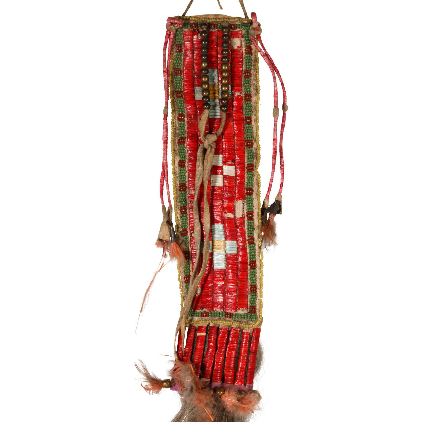 Exceptional Sioux hairdrop. Quilled center with outside edging of small, greasy yellow beads and in between green bands interspersed with red beads having small brass centers. Brass trade beads top and bottom. Feather fluffs and bull tail drop. Colors remain bright. On back is an old tag “Fred M. Smith, Antique and Curios 4585 College Grove Ave, Chicago, IL 111-5-WAPAINI Sioux.”