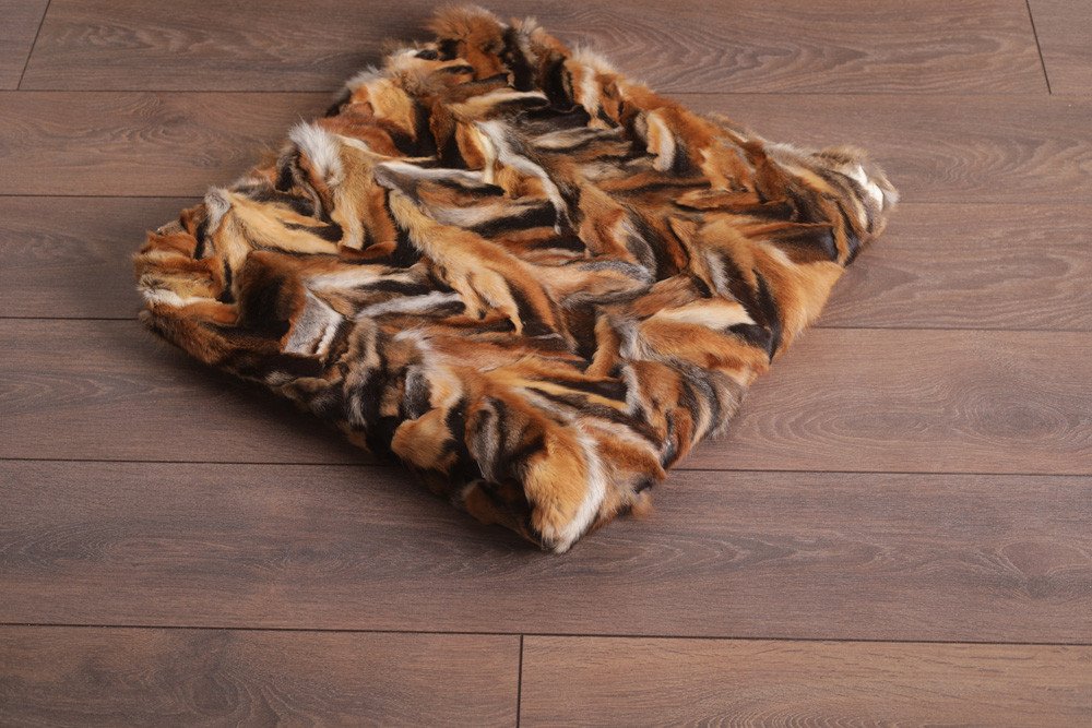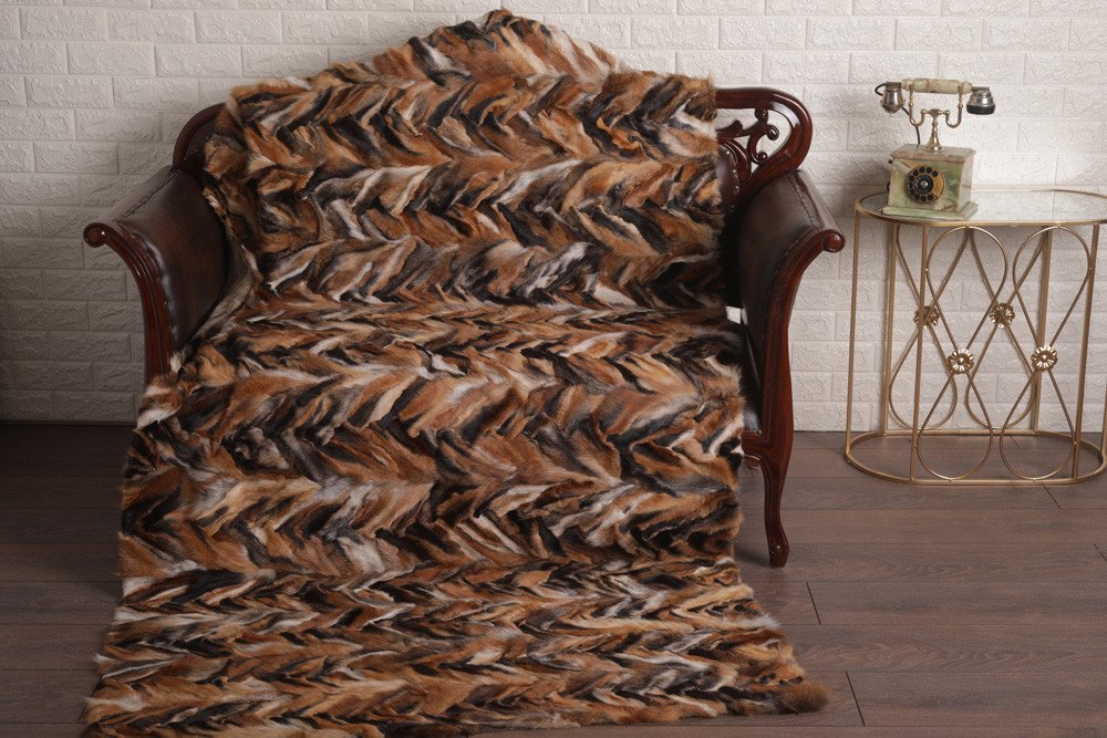 Each section of fur is sewn into a striking pattern that mimics the look of chevron wooden tiles, creating a unique and captivating design. This intricate pattern, combined with the natural variations in the fur, results in a wavy texture that adds both visual and tactile interest to the blanket.