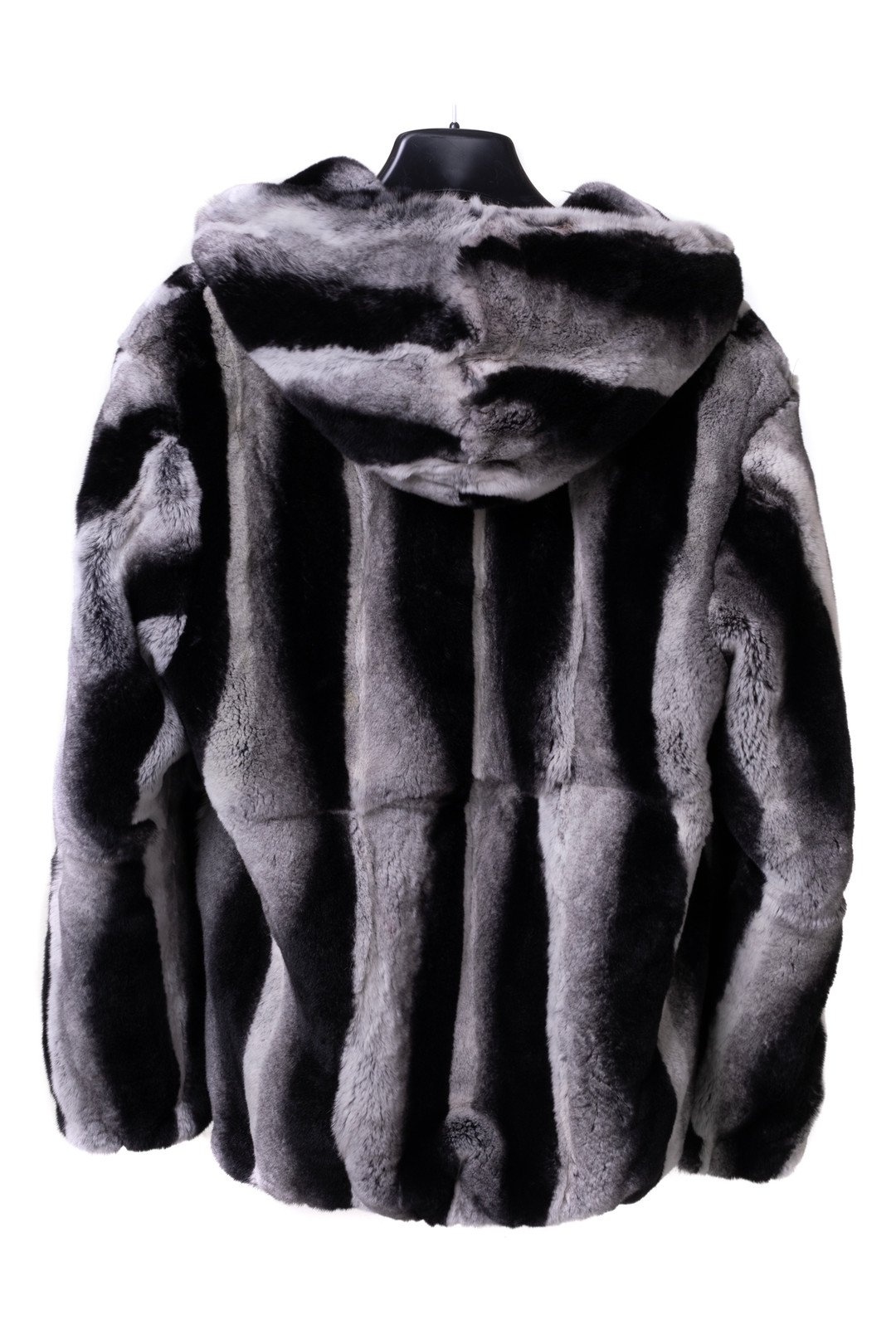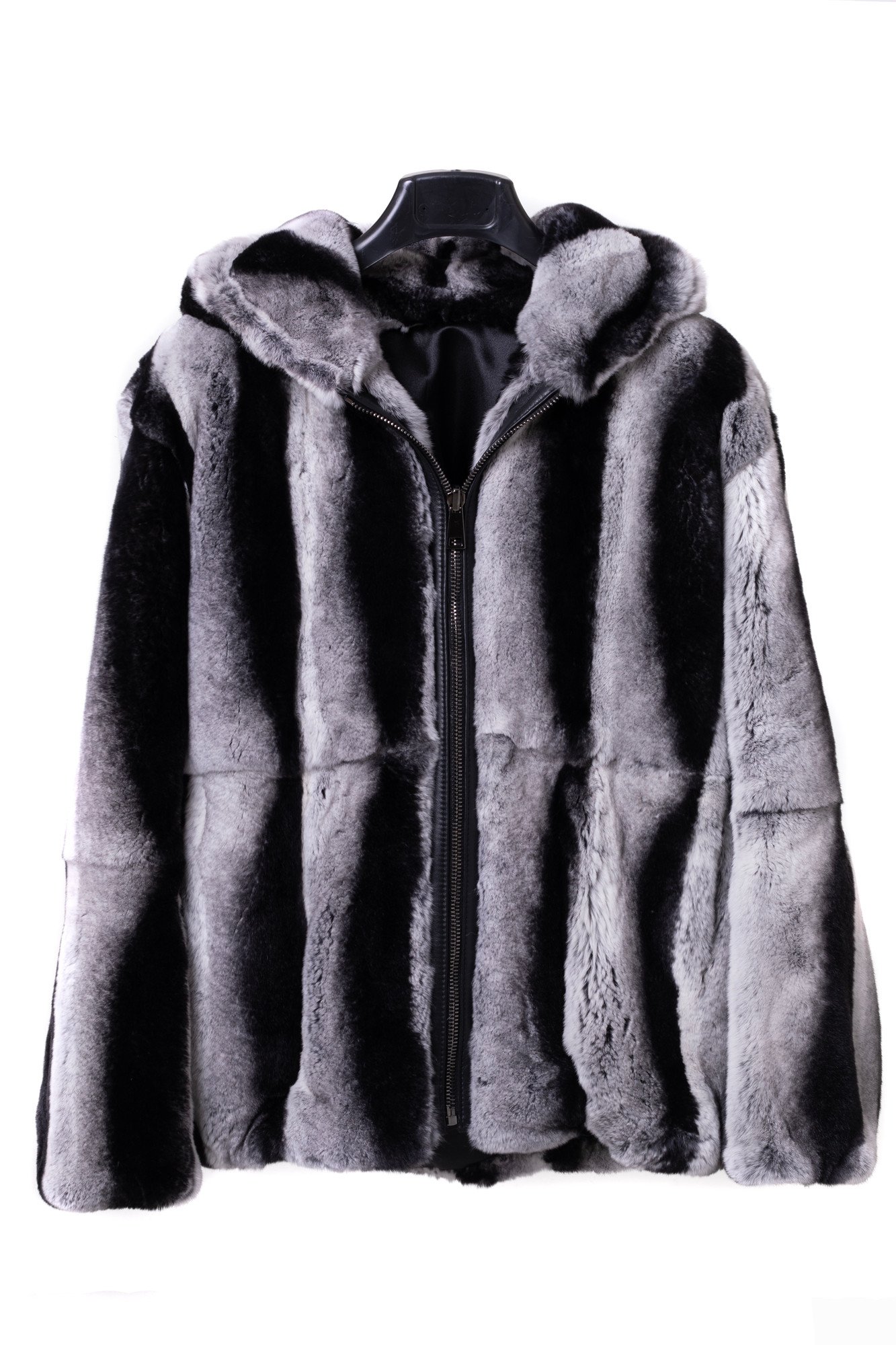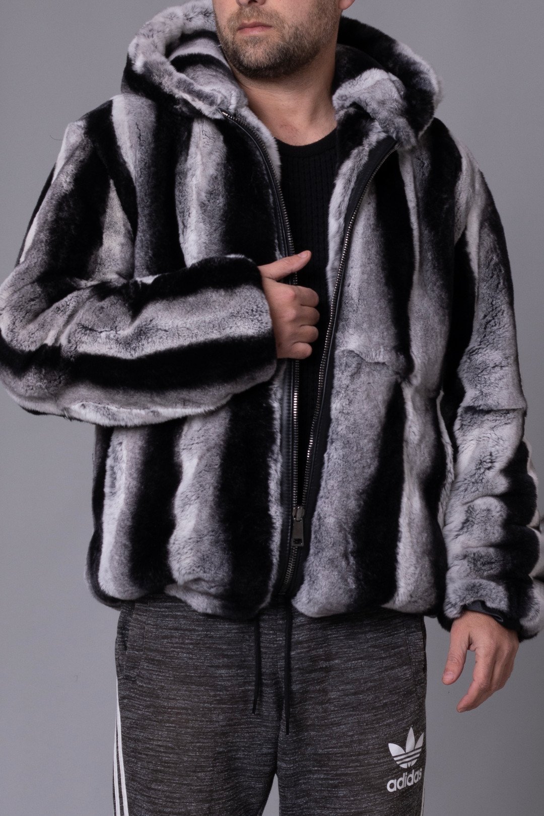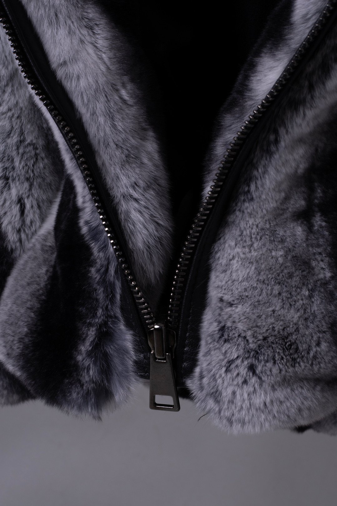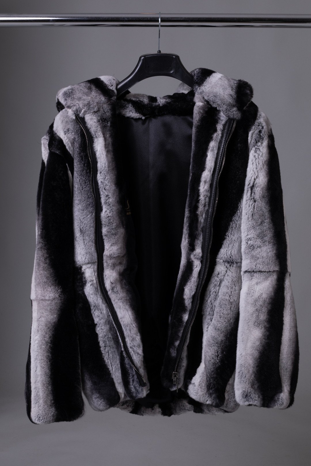 A luxurious rex rabbit bomber jacket, crafted from ultra-soft rex rabbit fur, with a 75 cm length (approximately 29.5 inches). The jacket features a hooded design, providing added warmth and style. It is dyed in a stunning chinchilla-inspired color, showcasing a mix of silvery grays and whites for a refined and elegant appearance.