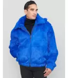 Look like a king in this royal blue fur jacket for men! The debonair design is formed in a classic bomber style with rich rabbit fur on the body, collar, and detachable hood. An elasticized bottom hem creates a comfortable fit along with a metal front zipper.