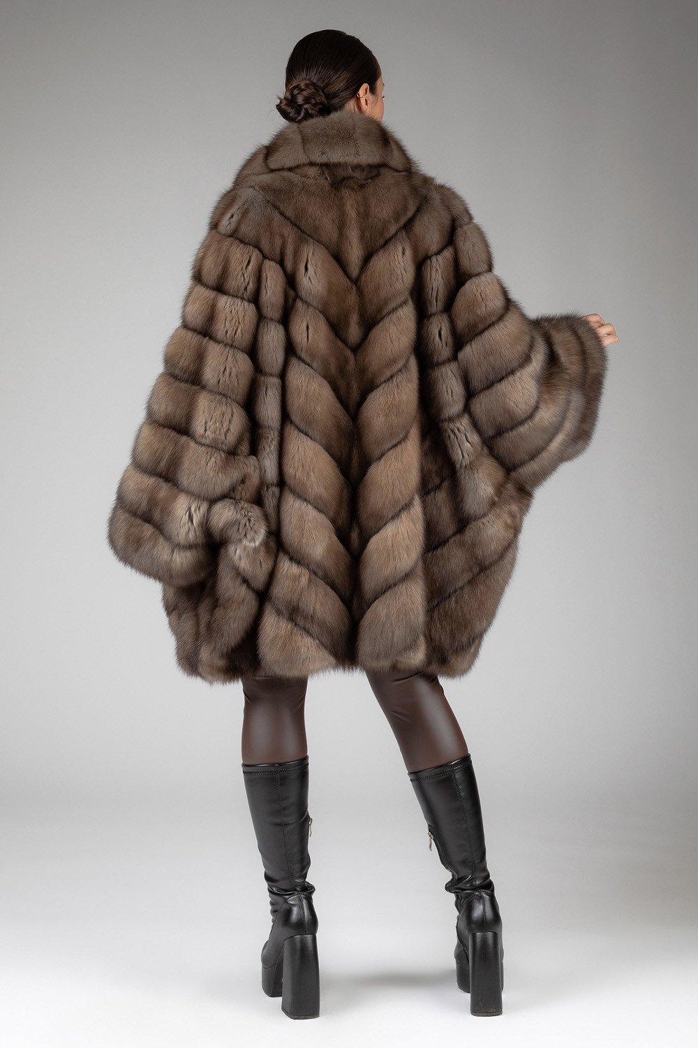 Luxurious Brown Sable Fur: Wrap yourself in the sumptuous embrace of brown sable fur, renowned for its unmatched softness and natural beauty. The rich and warm brown hue adds a touch of timeless opulence to your ensemble, making a statement wherever you go. Each sable pelt is carefully selected for its supreme quality, ensuring your cape is a true work of art.