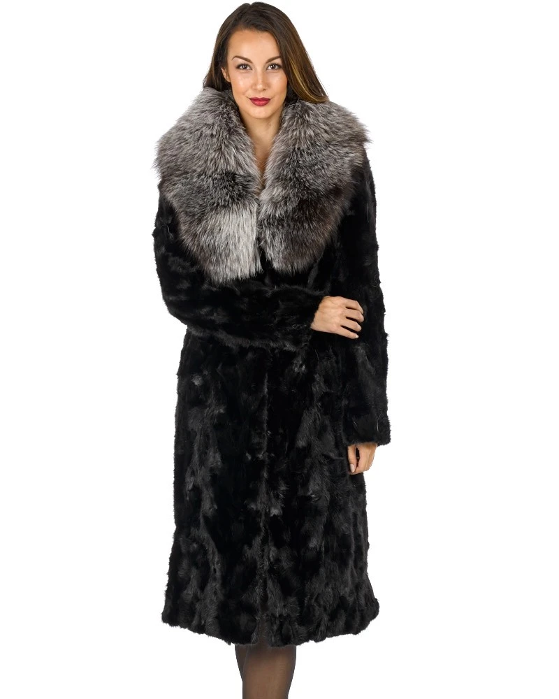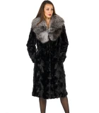 Our Black Sculptured Mink Fur Coat with genuine Silver Fox Fur Collar is sure to create that special look for any occasion. Silky soft sculptured Mink sections body with large genuine Silver Fox fur collar. One hidden snap fastener at neck and four hidden snap clip front fasteners. Satin quilt lining and two side entry pockets. Timeless design measuring 44 inches at center back.