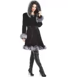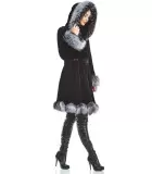 The Sheared Black Mink Coat with Silver Fox Trim is beautified with plush fox fur on the cuffs and sheared mink lined hood. A matching sheared mink belt hugs your waist with an interior drawstring with metal bell ends. Concealed snap clip closures and side entry pockets emphasize the look.