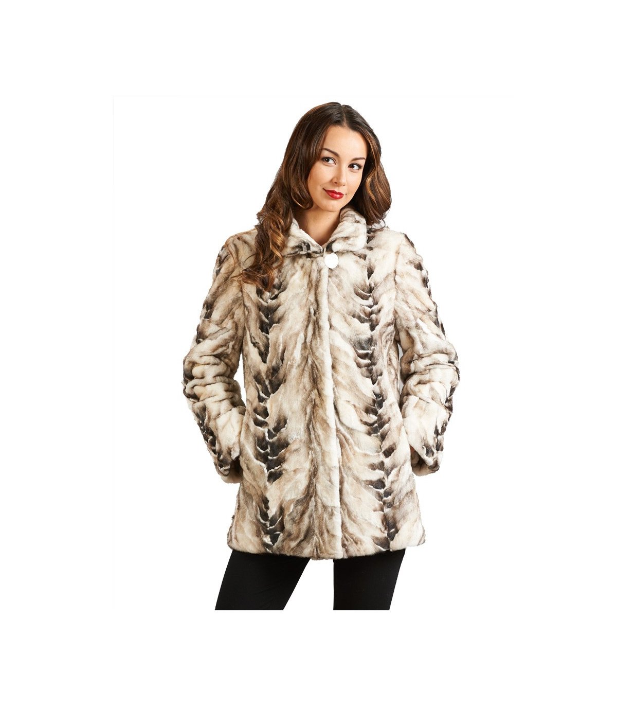 A display of mink fur in a tri-color design bedecks the beautiful style of our The Isabella Bleached Mink Fur Jacket. The versatile design reverses to a taffeta design. The front features two front pockets and a large button at the neck. The collar is adjusted with hidden metal inserts.