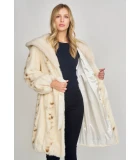 Our White Mink Fur Stroller Coat is an angelic design for women, crafted with glossy palomino cross mink for a breathtaking look. A large matching mink fur hood and a bling button at the neck creates a unique appeal with side entry pockets and closures to adjust your figure.