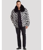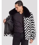 The fierce Zebra V-cut Mink Fur Bomber Jacket for Men is an exotic design with interior zip-up pockets and a silky lining while alternating black and white long hair mink fur decorates the exterior. With an elasticized bottom hem, two side entry pockets, and a luscious stand-up black fox fur collar, this jacket will keep you toasty warm on the coldest of days.