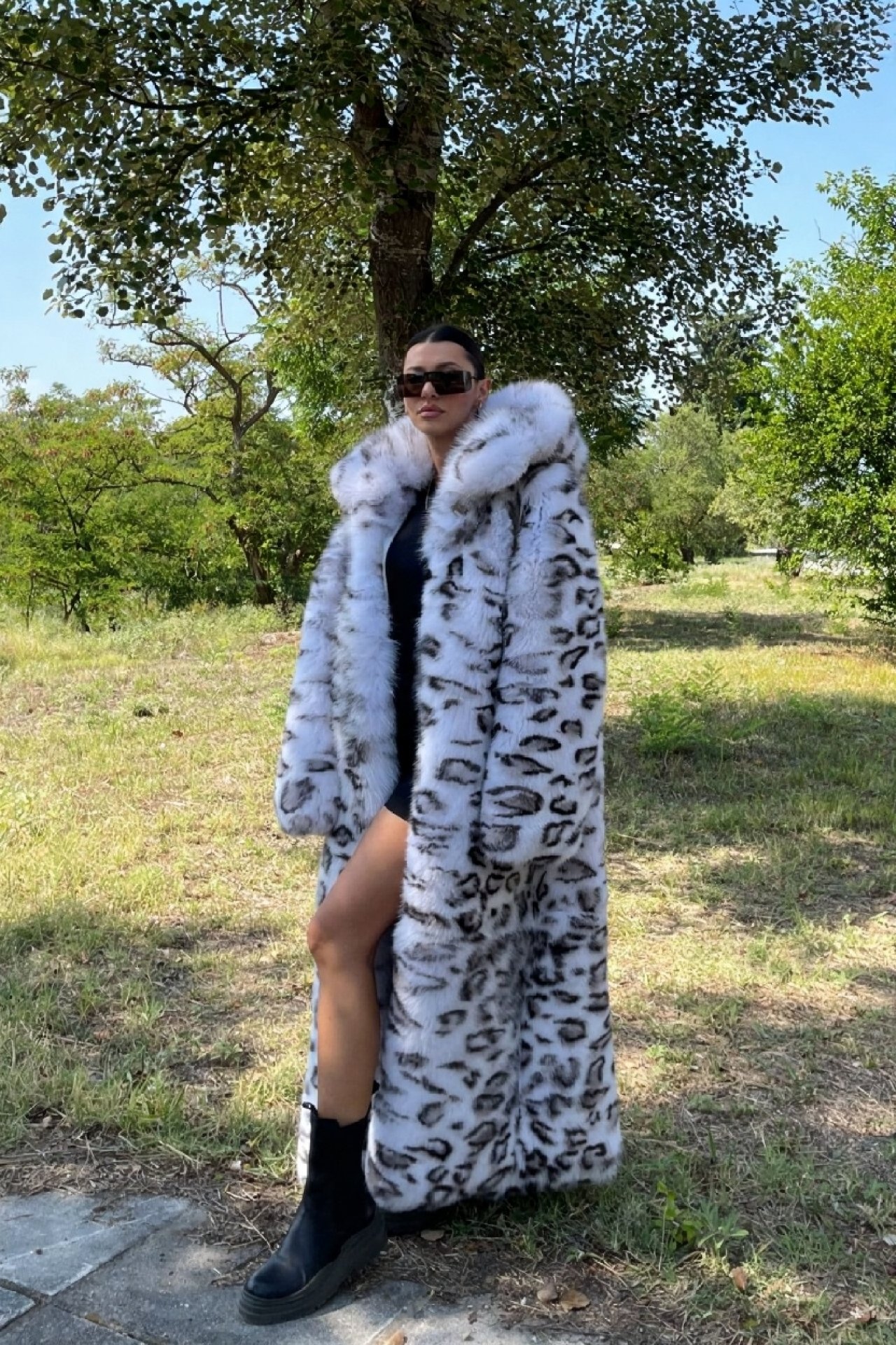 Griselda | Luxury Scandinavian White Lynx Print Fox Fur Jacket With Lavish Double Sided Hood